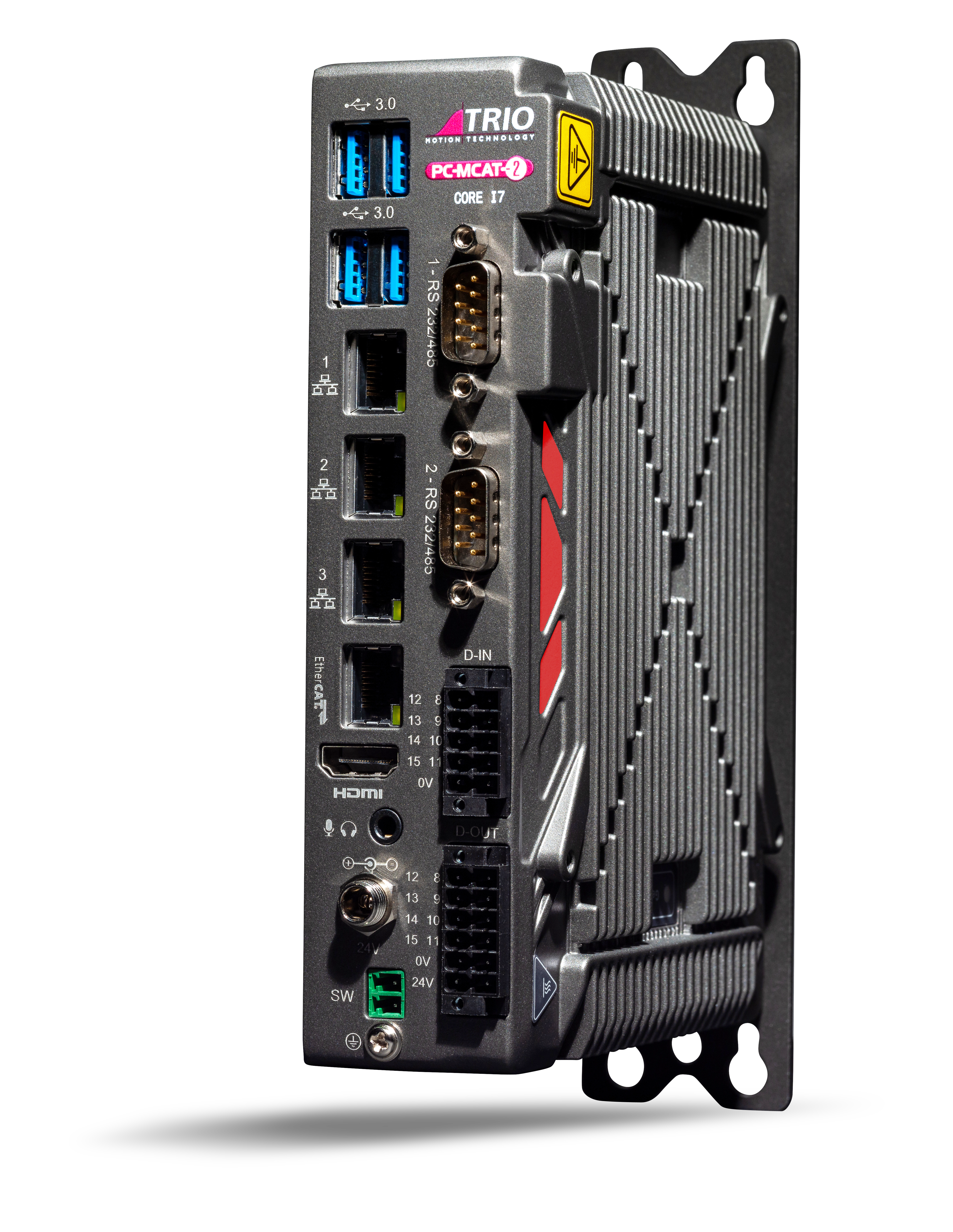 PC-MCAT-2 is an innovative ‘Motion + PC Solution’. A choice of Intel processors (from Celeron through to core i3 - core i7) is used to drive both a high performance motion controller and a compact PC that can run user applications under Windows. A rugged, finned metal case houses the controller and provides adequate cooling.